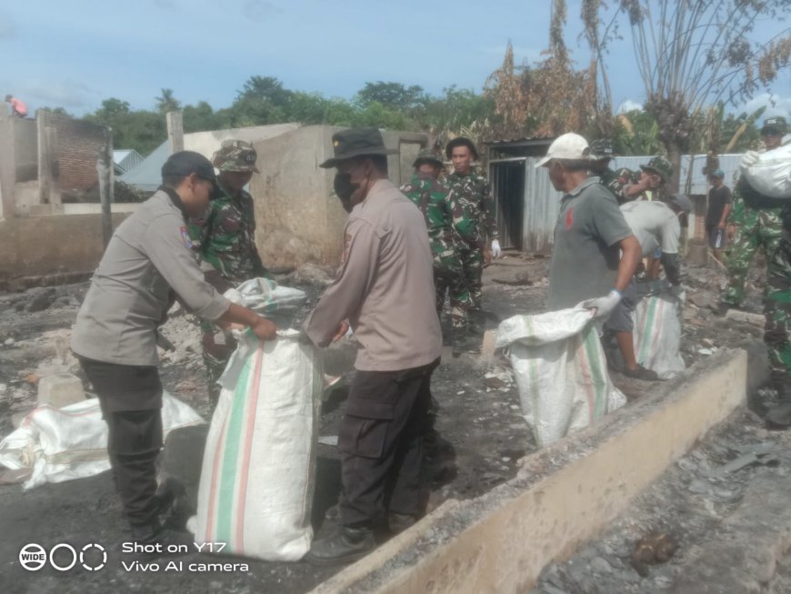 Wujud Sinergitas, TNI-Polri dan Masyarakat Alas Gotong Royong Bersihkan Puing Pasca Kebakaran di Desa Kalimango